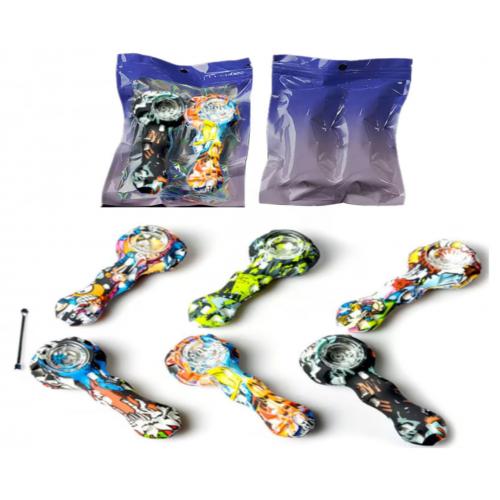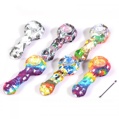 Silicone Water Transfer Printing Hand Pipe + Glass Bowl Stainless Steel Dabber Spoon Pipes Color Dab Rig Bongs Glass DabFeatures of Silicone Hand Pipe :
