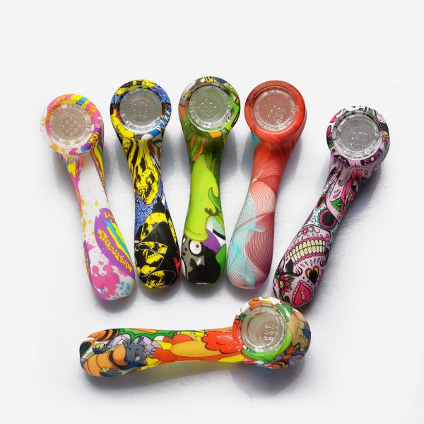 Portable Silicone Hand Pipe Water Transfer Printing Length 112mm With Glass Bowl Silicone Smoking PipeFeatures of Silicone Hand Pipe :