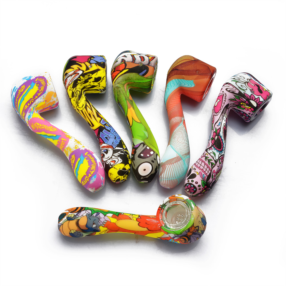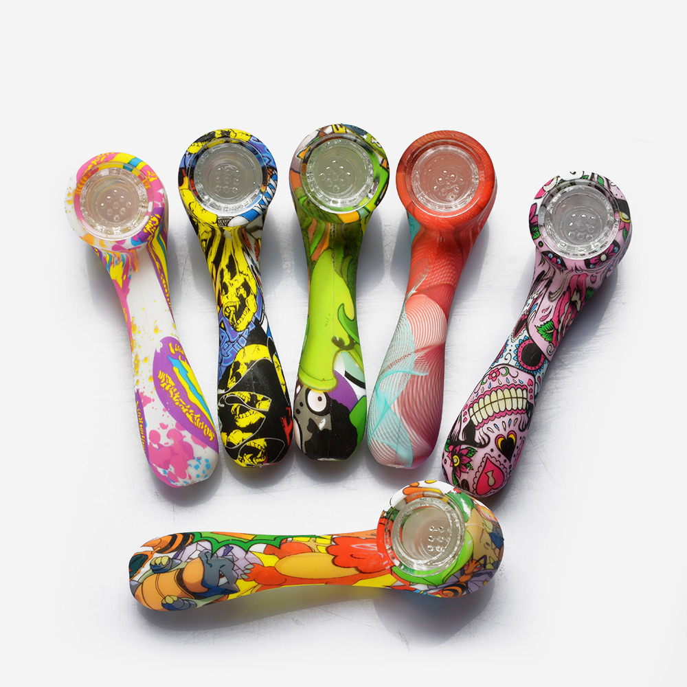 > Stocks on the Way > Silicone Products > Silicone Hand Pipes > Portable Silicone Hand Pipe Water Transfer Printing Length 112mm With Glass Bowl Silicone Smoking Pipe